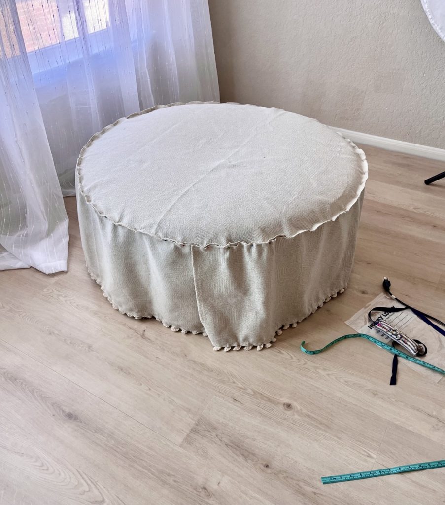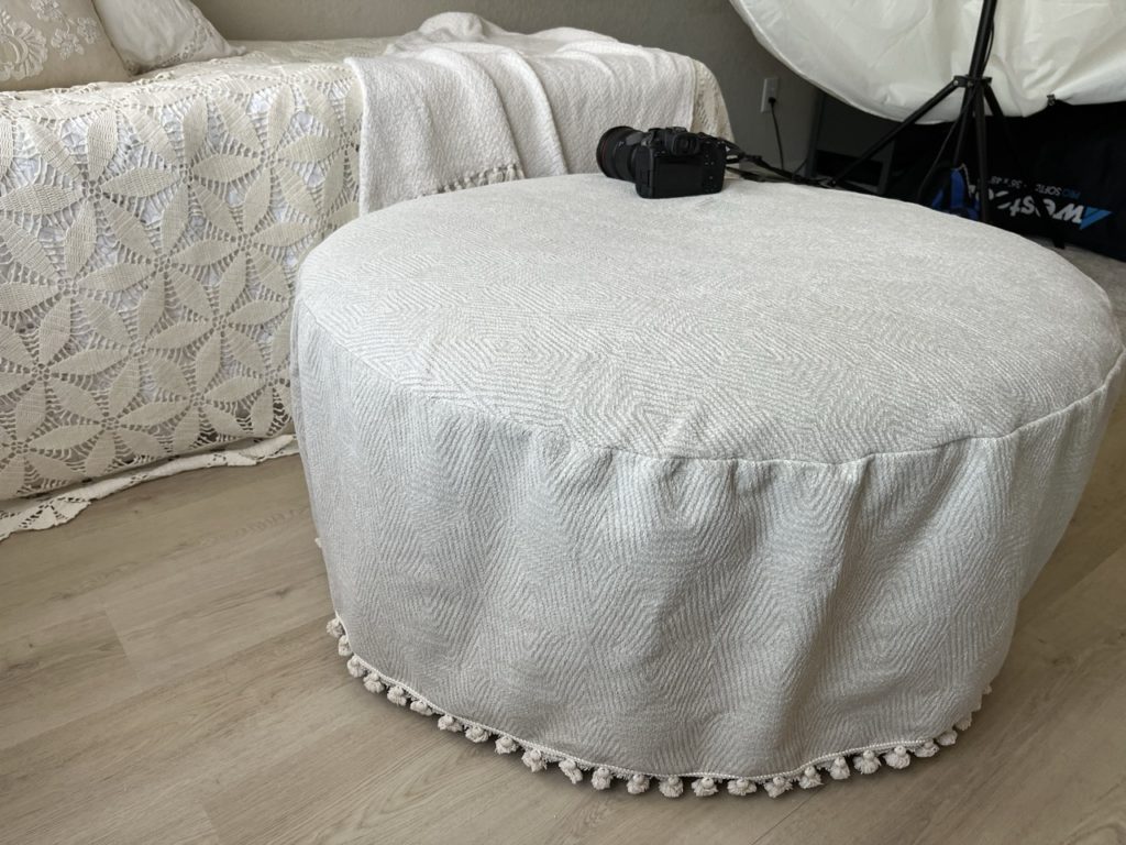 The other important part of this space was something large enough for a family to sit on for portraits (comfortably) but minimal enough to fade away in the image. I found an huge ottoman that was the PERFECT size, and covered it with a fabric the exact shade of neutral I was looking for! (I have to say, I’m not super skilled at sewing, but I’m pretty pleased with how the slipcover turned out!)