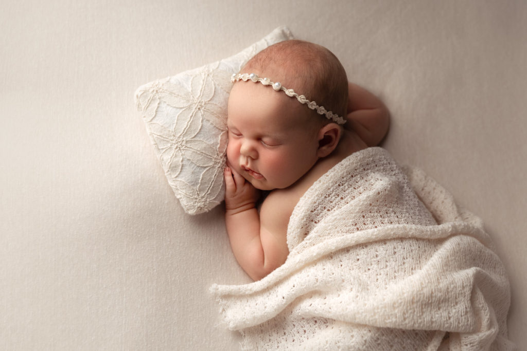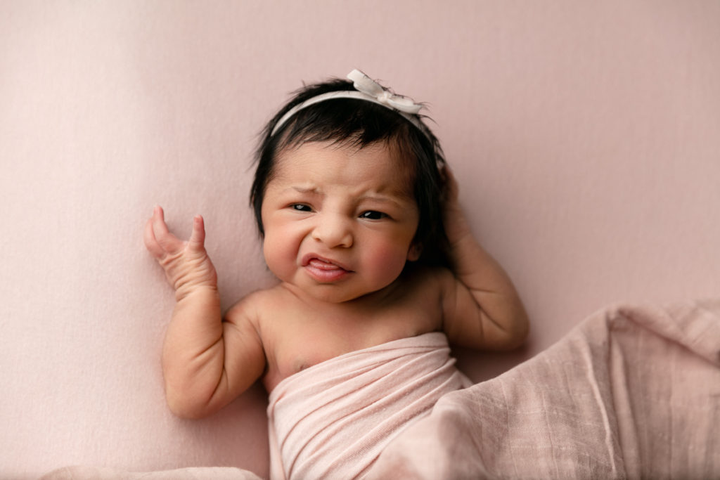 For my OWN session, I place babies that are awake on a flat surface and capture them exactly how they are. If their arms and legs are moving around quickly (and blocking their face) I will gently swaddle their arms/legs so that they are still and secure and so I can capture their expressions. If babies are sleeping soundly, I will either capture them swaddled in a prop, wrapped on my flat poser, or photograph them in the position they seem to prefer. Some babies like to scrunch up- as if they’re doing crunches in a workout! For those babes, I’llwrap their limbs close to their body where they seem to prefer them. Other babies like to stretch their arms overhead or stick their legs out straight! Those babies usually easily lay on their sides or perhaps their tummies. I can “feel” the way babies prefer to move when I’m holding them! So, I always pay attention to baby’s cues and pose them very gently in a way that lets me beautifully capture their little features.