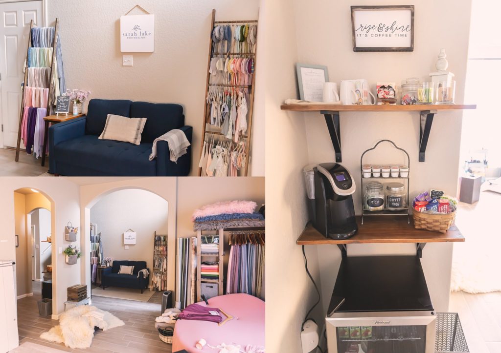 In the studio/shooting space, there is a small couch to watch all the action of the shoot, and a coffee nook with a Keurig for fresh coffee and tea, pre-wrapped snacks like granola bars, fruit leather, crackers, and instant oatmeal (if someone forgot to eat breakfast), and a fridge with water, juice, and cheese & crackers. Of course, you’re welcome to bring along any favorite snack for your family, too. (Just rememnber to stay away from messy things like Cheetos or colorful things like fruit punch!)